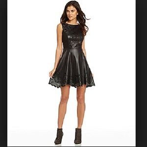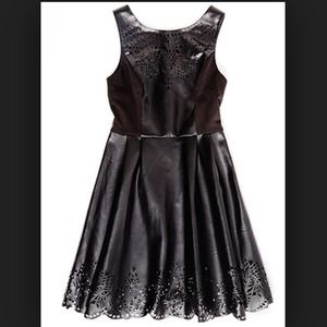 A precision cut pattern punctuates the sleeveless body and flared hemline of a faux leather rocker chic dress tampered by an ultra-feminine silhouette. From Nordstrom.