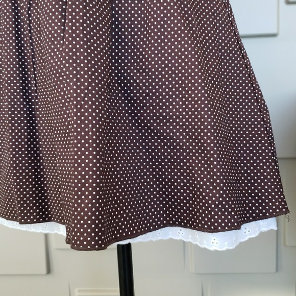 Yummy rich mouthwatering chocolate brown and white dress sundress. Small white polka dots with white eyelet waistband. Gathers at bustline. Ties at the back. Cute petticoat like slip under full skirt. Beautiful cond. Cotton spandex blend. Size 5 Juniors