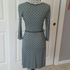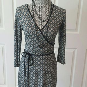 Black and blue geometric design dress with black trim. Faux wrap with tie at waist and side zip. Above the knee. Machine wash delicate.