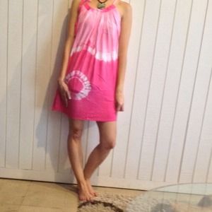 Gorgeous bubble gum pink tie dye dress from Bali. Lightweight rayon cotton is perfect and wearable for summer. Feature a tie area on neckline adjusting to fit comfortably on the shoulders and loose flowy design accommodates ladies who wear a size small-xl comfortably. Gorgeous design is perfect for beachy balmy summer days. Very comfortable and very wearable!