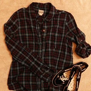 pink, turquoise and black plaid long sleeve shirt, can roll and button up sleeves, washed never worn, rivet detailing on back below collar
