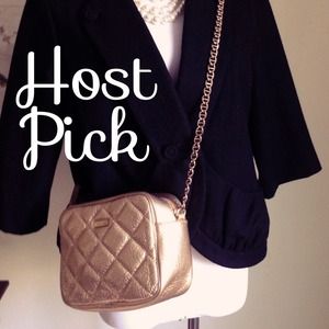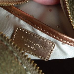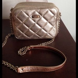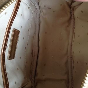Metallic shimmer on this gold crossbody, some wear on shoulder strap, no cracks or flakes. Tiny makeup mark inside, will wipe out!