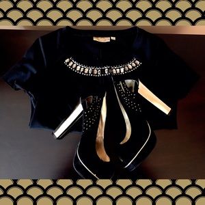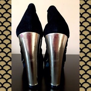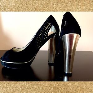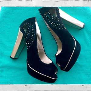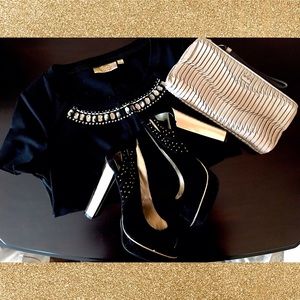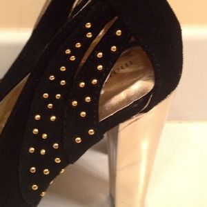 πHost Pick x3- 10/8: Romantic Lux Party, 3/7: Rockstar Style Party & 10/21: Wardrobe Refresh Partyπ Sexy faux black suede with gold embellishments. Shoe has a 5" gold square heel. NWT and gorgeous for a night out on the town πΈβ¨