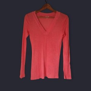 This shirt is in good condition. It features a v-neck design and long sleeves. It is slightly see through so a cami may be needed.