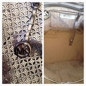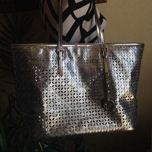 Authentic Michael Kors Flower Perf Travel Tote Bag . Silver , Med . With metal Feet on bottom of bag for protection . New with Tags .. NO TRADES