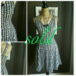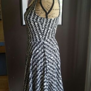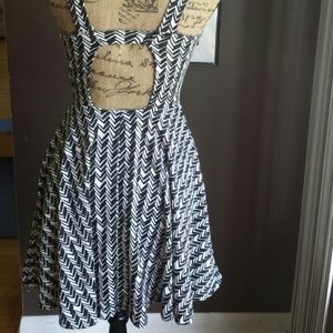 Super cute for the summer. Form fitting on top and flares on the bottom. Back is open. Stretches. Happy to answer any questions.