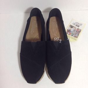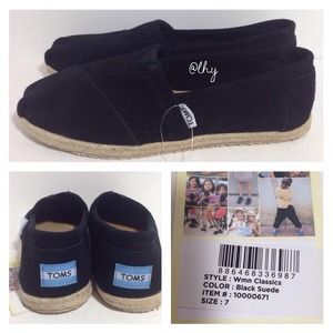 Retail Price $74. Authentic! Size: 7. Color: Black New without box. Black suede upper with tonal stitching. Signature pleated square toe. TOMS logo patch at heel. Cushioned leather insole; suede lining. Espadrille midsole. Rubber/textilng sole. Tags attached; box not included. Please be familiar with sizing of TOMS footwear; size 7. ❌❌NO TRADES NO PP PLEASE DO NOT ASK❌❌tradesy