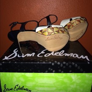 Black & White Sam Edelman sandal with multi-color platform. Open toe. Crisscross leather straps at vamp. Ankle strap with side buckle closure. Stiletto heel. Approx. 5.25" heel, 1.5" platform.