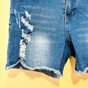 Trendy distressed jean shorts by Urban Heritage, featuring raw hems and light fading for a laid-back look.