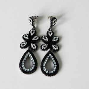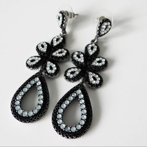 White glass beads inlaid in gunmetal teardrop frame. Stud chandelier earrings. Backings included. Never worn!