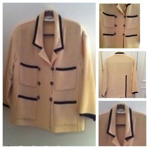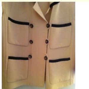 So Beautiful. AUTHENTIC CHANEL JACKET BLAZER in Cream with Navy Blue Trim. Lovely accents of Chanel Buttons and Pockets. Fuller & Longer design. Fabric is like light soft boucle. Hard for me to part with this elegant Chanel piece. Perfect for professional outfits paired with skirt, dress and pants. In excellent loved condition. CHANEL label secure - Size Label fell off. Fits size 12 14. You may use the Poshmark Concierge Service to verify authenticity.