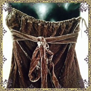 Empire waistline, crushed velvet. Bust is ruched styled type of gathering. A sash sewn to the the bottom of the  bust. Sash hangs down 1.5” double folded..leaving room for a tie back bow. the back of the dress falls straight down, into a delicate trumpet. elastic is measures 29” unstretched. Velvet is brown with flash, purpley without flash.