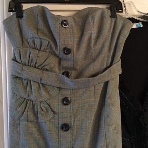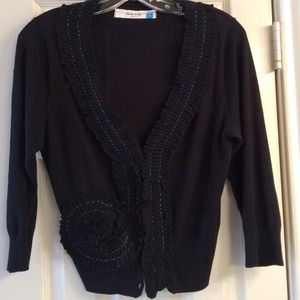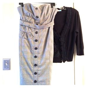 Black, white houndstooth strapless dress with subtle turquoise stripes. The dress has faux buttons down the front with an attached belt around the waist with a hidden side zipper. An ingenious rubber like band is placed around the top of the dress to help it stay in place! The black Sparrow cardigan (size M) is 100% cotton and has 3/4 length sleeves. There are ruffles & a turquoise stripes on the front edge of the sweater