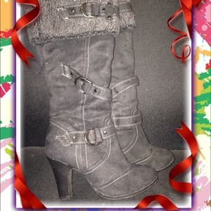 Black faux suede boots that has buckles for added look. Zips up on inner sides of boots. 4" heels. New without box.