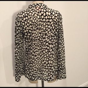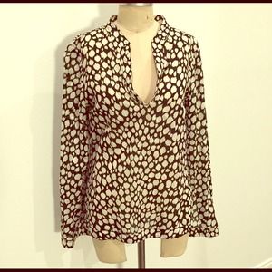 Cotton tunic top from Tory Burch. Black and white stylized leopard print with subtle clear sequins in patches. Long sleeved; slits in sleeve hems. Slits at side seam hems as well. Notched neckline with collarless neckline band. Dry clean. Sz 10, fits 8/10/M well.