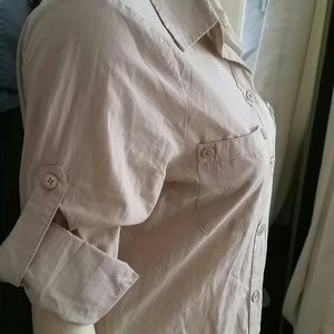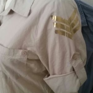 Tan button down shirt Derek heart medium measures 29 inches from shoulder to hem..sleeves button up but can be let down to 17.5 inches.