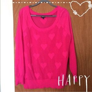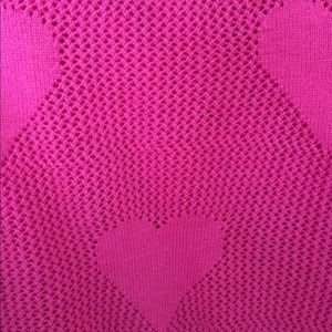 Very cute and fun! It's a bright pink sweater. It has hearts on the front and back. The middle part of the body is slightly see through. The sleeves are not see through. Great condition.