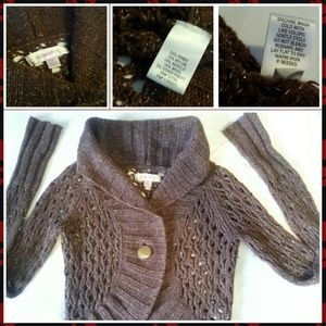 Embrace texture with this swaeter jacket. Brown and gold fabric, gold accented front button closure. Shawl neckline. Work or play. 54% Ramie 15% Nylon 14% 14% Wool 3% Other Fibers, machine washable.