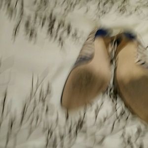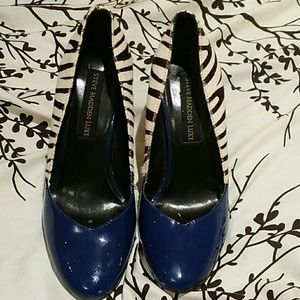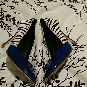 Very stylish, sleek looking shoes. Royal blue with black and white hair craft zebra print, about 4 inches high, very comfortable to walk on, only been worn 3 time