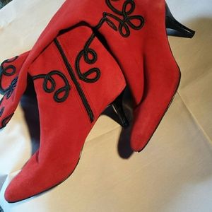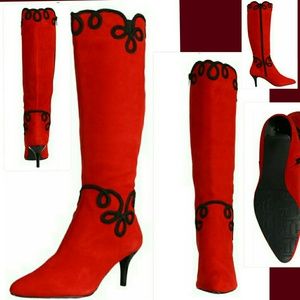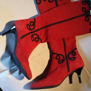 Previously worn, J.Renee Paulina knee high boots. Red suede w/ black embroidered accents. Full zipper. 2.5" heel & rubber soles. Can provide additional pics if necessary. Some wear spots shown in pics. Heels are marked up but still look good. This boot runs small for a 9m.