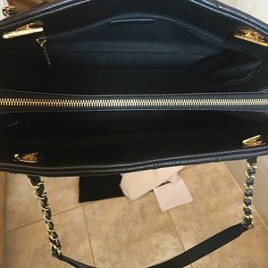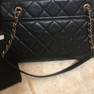 CHANEL Timeless Tote black quilted caviar leather w/ gold chain. Sticker on box says Grand Shopping. Not sure of name. Middle zip compartment, 1 inner zip compartment, 2 outer button close pockets. About 13"L, 5"W, 8"H.