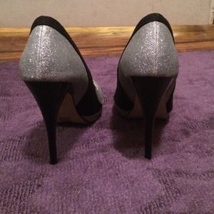 Sparkly heels with black accents size 6.5. Only worn out once or twice. No wear or tear on shoe or heel just on bottom from walking but not bad at all!