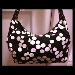 Dark brown purse with white polka dots features gold hardware, exterior pleating, and an interior zipper pocket. There is some dirt on the dots by the zipper. It's not too noticeable and could probably be cleaned. It measures approximately 12" x 9" with a 9" strap drop. I purchased this bag from Macy's several years ago so it is authentic. Comes from a smoke free home.