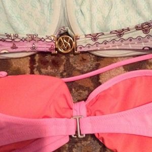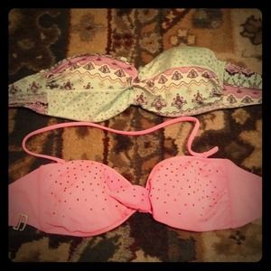 My two favorite bathing suit tops! So sad to see them go! They don't fit me anymore but I love them so much !!! The turquoise and purple wi sparkles is one season worn and the pink sparkles is two seasons worn. Always took care of them never put in the dryer -- always hung to dry. All sparkles are in tact and hardware is perfect too. Both have removable padding size small & 34B