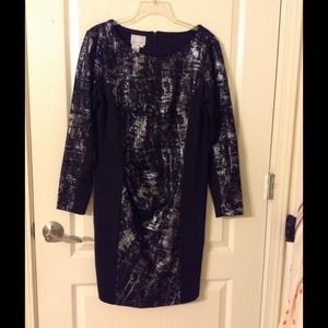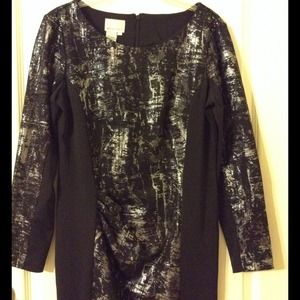 Excellent condition. 77% polyester 21% rayon 2% spandex. Dry clean. Back zip. Beautiful dress. Color black and silver accent.