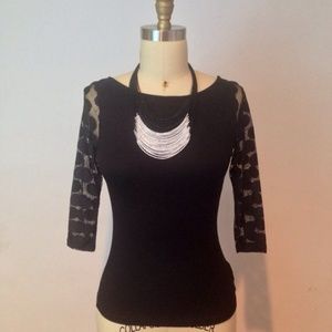 NWT 3/4 sleeve top with sheer polka dot sleeves and back. Low scoop back. Fitted style but has front has some stretch. Fabrication: front 100% viscose back 100% polyester. Necklace not included. Please comment if you have additional questions