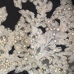 black/champagne, Floor length mermaid gown features a sweetheart neckline and beautiful lace appliques