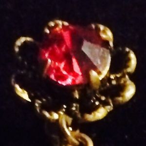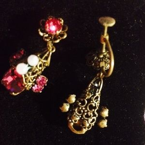 These are so pretty & ornate! The sweetest raspberry pink gems, one centers the top flower, a larger one is wrapped in the teardrop scroll work dangle & 2 flank each side, a ttl of 6. There are 2 white stones in the middle, almost like they're supposed to be buttons these earrings measure 1.5" long x .5" wide x 1/3" thick.? All stones & moving parts intact. Price Firm .