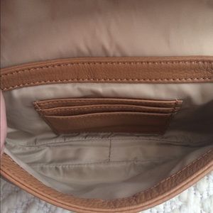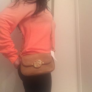 A bold monogram medallion fronts a mainstay crossbody bag cast in lush leather. Magnetic-snap closure. Optional, adjustable strap. Three interior card slots. Leather. Color: Tan. New with tags and dust bag!