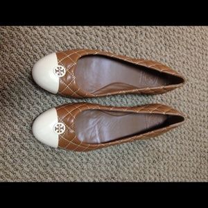 Adorable Tory Burch flats. 100% leather. Brand new, never been worn. Toe is a cream colored patent leather, while the rest of shoe is a tan quilted leather. Gold Tory Burch Logo on each shoe.
