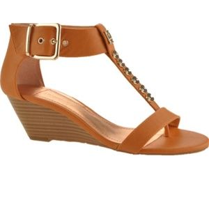 A smoking T-strap features metal studs and the mid-height heel adds a touch of lift to your already sexy look of these wedge sandals. Fit: True to Size. Upper: Madras Leather, Madrina Leather.