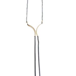 A modern twist on a classic silhouette. A tassel necklace with braided chains that meet at a sleek curve in the middle