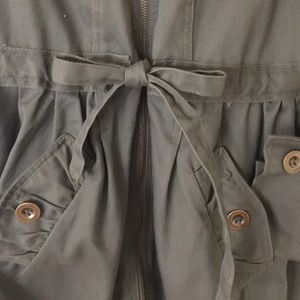 Camo Green Jacket. 31 1/2" inches long from top of shoulder down. Zipper front. Two front side pockets. Tues in front. Super cute. I'm keeping a tan one. Size Medium