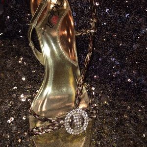 ✨Dazzling gold heels are sure to turn all heads✨ They have beautiful gold/copper/rose gold metallic braided sling backs with rhinestones on the buckle. Worn once, very minimal signs of use.