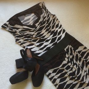 This jersey print dress in a cocoa combo is great for the office or dinner out with friends! Great for any season as it pairs easily with a black heel, or a black boot and leather jacket. Sleeveless with a draped neckline. Thick black waistband with a subtle cream stitching sits lower on the waist for added definition. Skirt has a beautiful drape in the front with overlapping feature that creates a wrap dress effect. Polyester/Spandex blend. Worn once and in perfect condition!