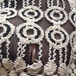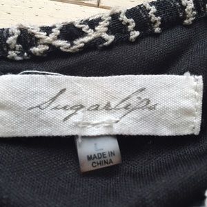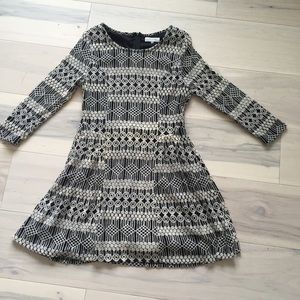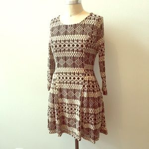 Gorgeous fit & flare dress from contemporary brand, Sugarlops. Jewel neckline with fitted, 3/4 sleeves. Fitted through bust and waist, with pleats that flare out into a 1/2 circle skater skirt. Fully lined, stretch cotton/nylon blend fabric. Size L, *Runs small, marked as a M for this reason. One tiny pull at the underside of one sleeve, see last picture, very slight and in an inconspicuous place.