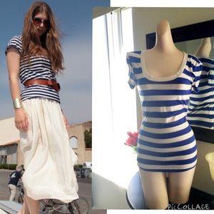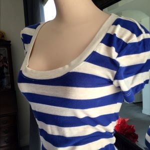 Navy and Cream Stripe Scoopneck Tshirt. Beautiful warm navy blue with a light cream scoop neck cut top. Lightweight super soft cotton stretch blend. Minor piling, hardly noticeable. Juniors Size Small, fitted top. SAVE AN ADDITIONAL 20% WITH BUNDLES