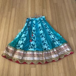 Beautiful net teal green half saree with red brocade blouse. Blouse has pads attached for extra support. Tassels attached to skirt. Easy to wear for any party.