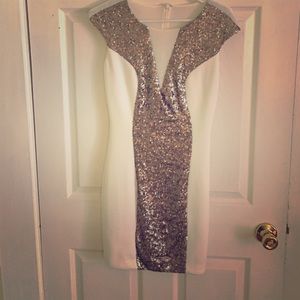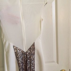 Gorgeous white dress with silver sequin detailing on the front and back. The V-neck in the front and the entire upper back portion are a sheer white material.