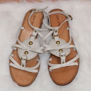 Miu Miu jewel crystal sandals // White leather with bronze hardware // Size 39 // Stunning jeweled crystal heels // 1" short heel // Retail $505, still have original tag attached to bottoms // Preowned and leather does have some marks/stains on them in front. Back straps have some gaps between leather - see photos // Guaranteed 100% authentic // Sorry no dustbag or box // Sought after sold out style