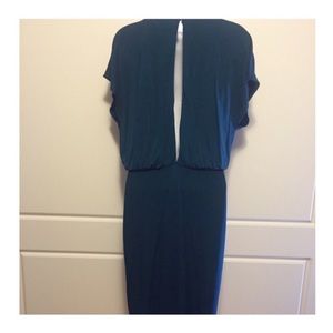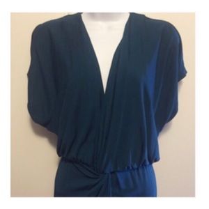 Edgy elegance! Beautiful deep teal color with a deep plunging v neckline (comes with a hook to keep it together). Short dolman sleeves and twisted knot detail at the elasticized waist for a slimming effect. Elongated keyhole in the back that closes with an iridescent button at the top.