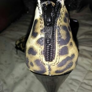 Size 8 leopard print 6 inch heels with 2 inch gold tip toe platform. Rear zipper. Beautiful condition. Only tried on inside, not worn outside !!