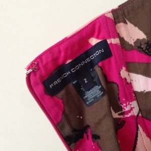 Colorful cotton strapless mini dress by French Connection. Sweetheart neckline and side bow, that can be wrapped in several different ways. Boning on the top, that holds the dress up really well. Pink, light pink, brown and black print. Worn only a few times. With pockets! In great condition! (Yellow dress only used to show how the dress fits). ๐Host Pick!