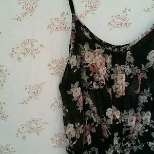 Black floral print romper. The shorts part is lined(as pictured) but the top part is sheer. I only wore this once. It does have pockets! Which I'm such a sucker for. Gold buttons down the top half but just for looks.