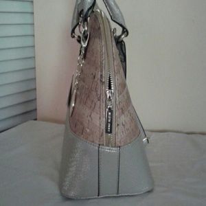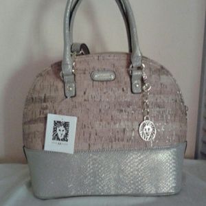 Gold Metallic snake and cork ANNE KLEIN handbag, double handles with zipper opening and detachable shoulder strap, two small inside pockets and one large zipper pocket, gold medal can be used for a KEY CHAIN