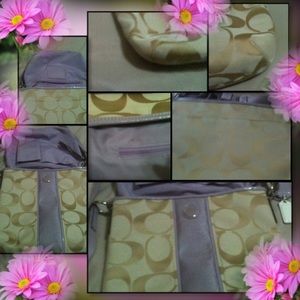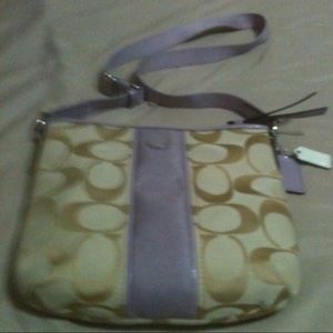 Coach signature khaki / lavender. M1305-29561E. 8.5" H x 8" L x 2.5" D. 24" adjustable strap. This is purse sized, not the small cross body messenger bag. Perfect condition, few tiny blemishes as shown, see extra pictures for more details. Can very easily be cleaned